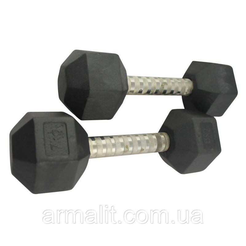 Гантель нерозбірна із шестикутними вантажами, перешкоджають катання гантелей по підлозі.